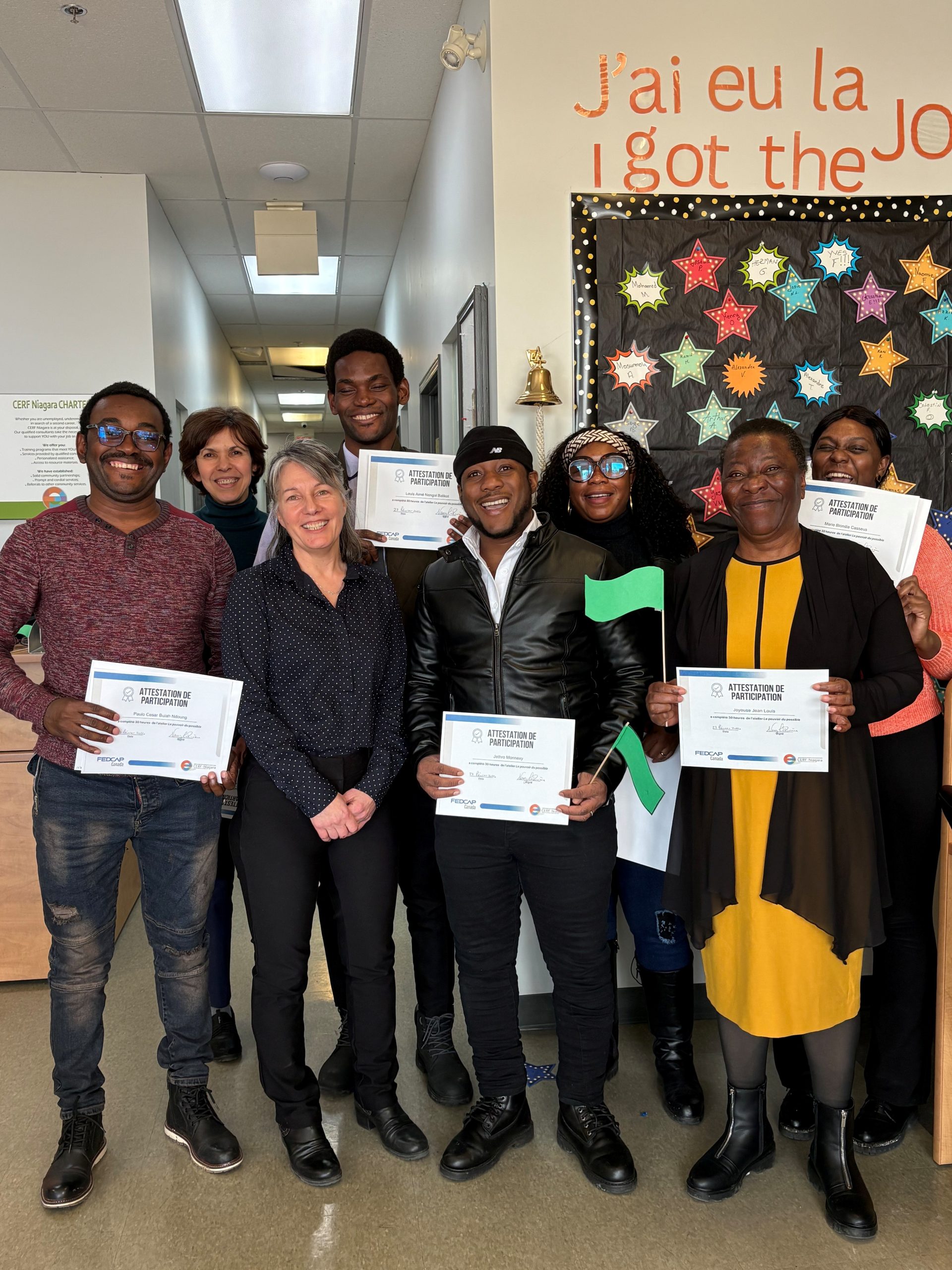 Photo : Nancy Larivière et les participants qui reçoivent leur attestation. (Crédit : CERF Niagara)