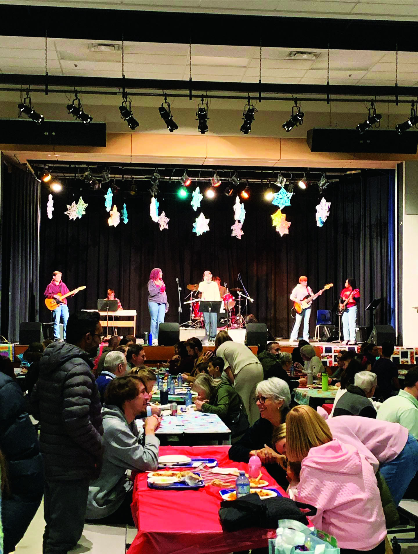 Plus de 250 personnes ont participé à la soirée. Dès 17 h, les musiciens de l’école, accompagnés de l’enseignant Jean-Louis Frado, ont animé la soirée avec un répertoire de chansons de Noël. Tous volontaires, les élèves ont contribué à créer une ambiance festive et chaleureuse. Pendant ce temps, des activités ont été proposées aux enfants dans le gymnase, sous la supervision de bénévoles, permettant aux parents de discuter entre eux. Des ateliers plus calmes et artistiques, comme le coloriage, l’écriture de lettres au Père Noël et la confection de décorations pour l’entrée de l’école, ont également été offerts.