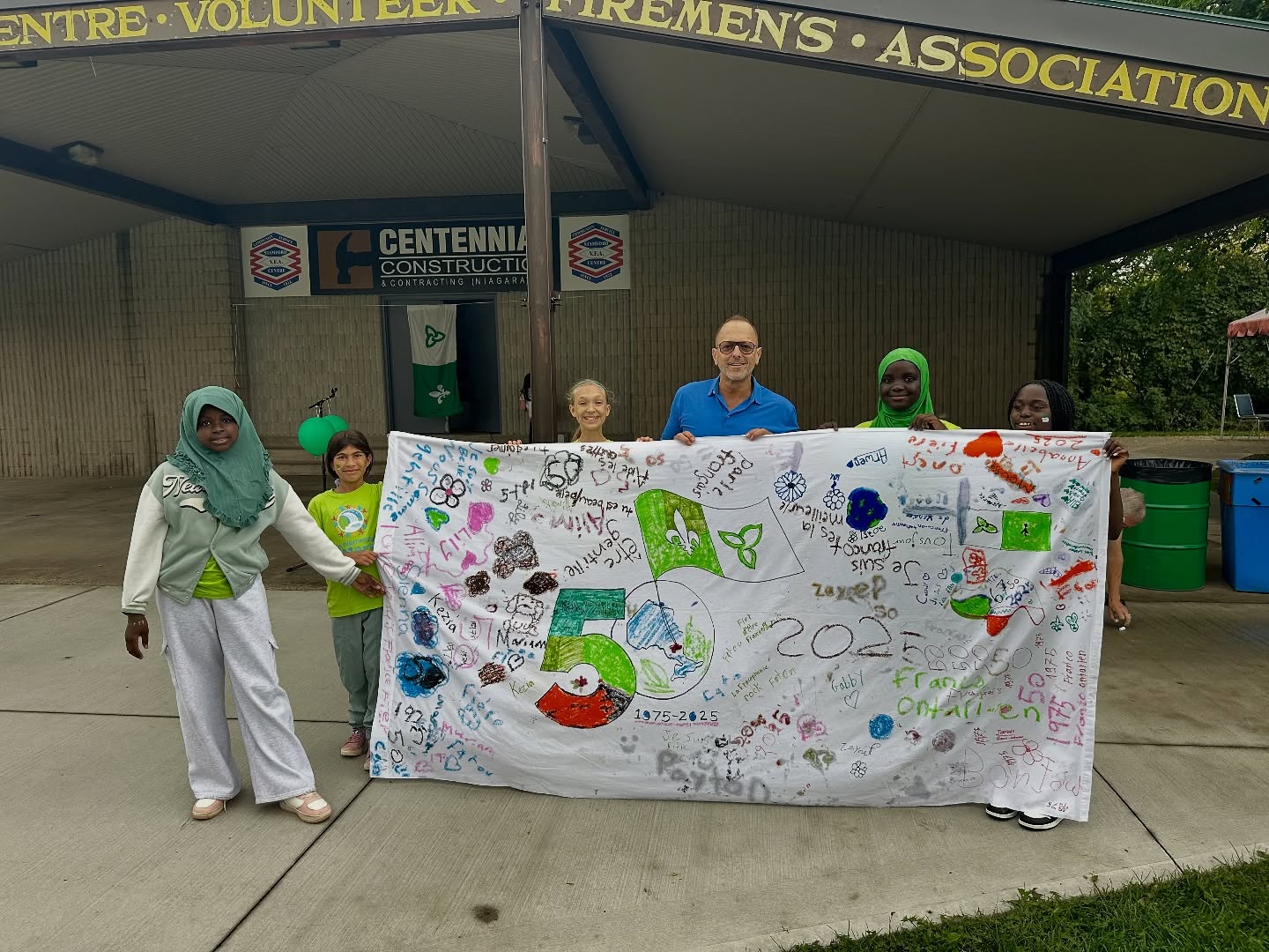 Photo (Crédit Interagence du Niagara) : Le maire de Niagara Falls, Jim Diodati, derrière la banderole du 50e conçue par les élèves de l’école LaMarsh.