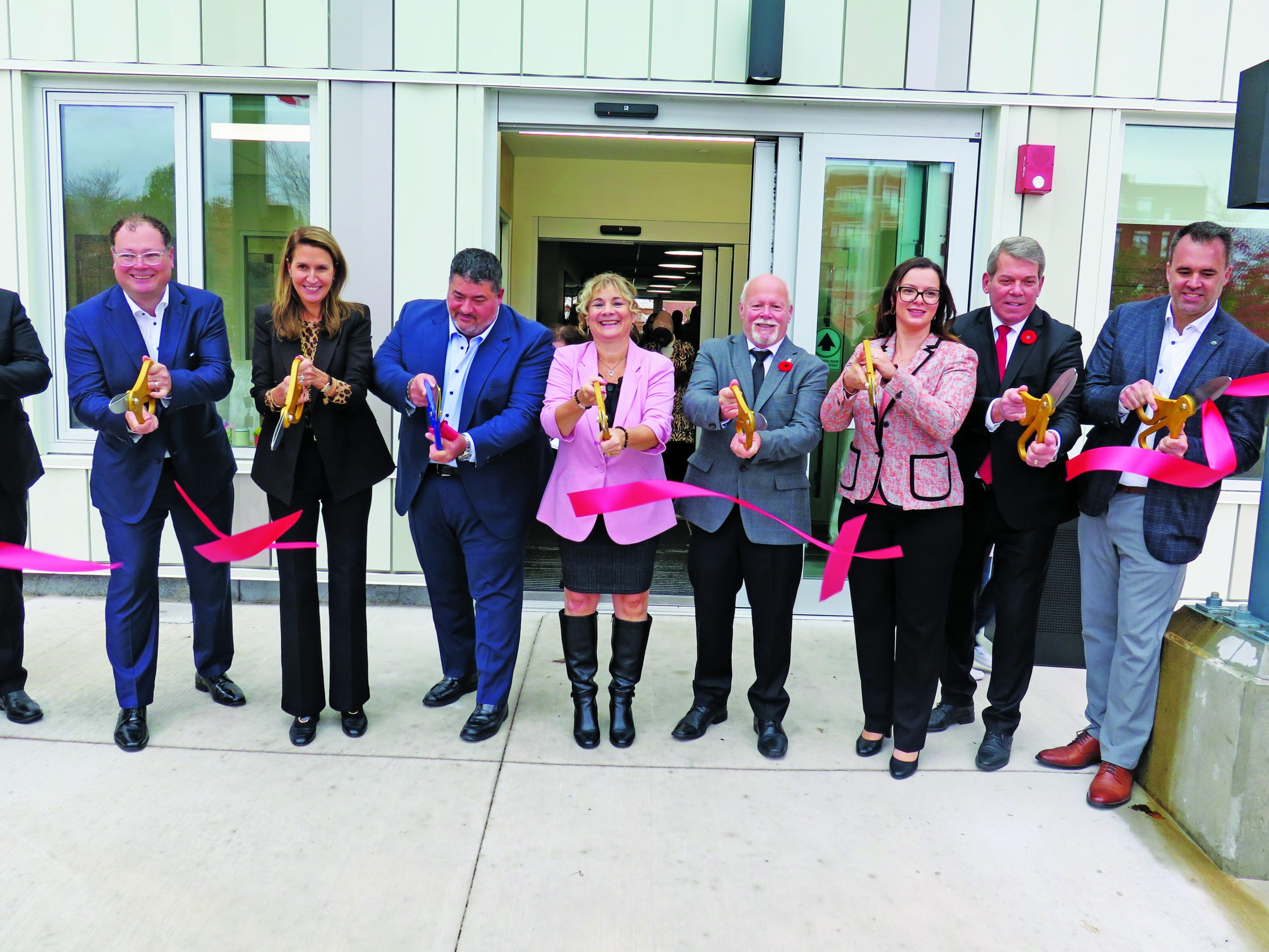 Photo : La coupe du ruban. De gauche à droite : Sean Keays (directeur général du Foyer Richelieu Welland), Caroline Mulroney (ministre des Affaires francophones), Mark Basciano (propriétaire de Mountainview Building Group); Muriel Thibault-Gauthier (présidente du Foyer Richelieu Welland); Frank Campion (maire de Welland); Natalia Kusendova-Bashta (ministre des Soins de longue durée); Vance Badaway (ancien député fédéral de la région) et Jason Bernard (président du Club Richelieu Welland).